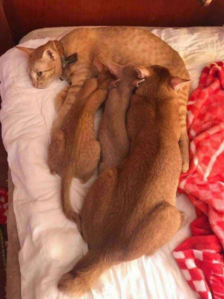 “Le briciole crescono rapidamente, ingrassano. Nefrite fa le fusa mentre i gattini mangiano e si addormentano tutti abbracciati”, aggiunge Jen.