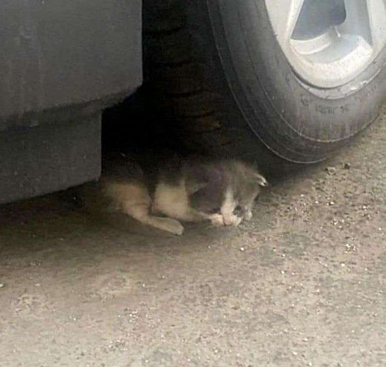 Piccolo gattino trovato sotto un'auto in una giornata calda. Le condizioni del bambino erano deplorevoli, ma la sua gentilezza lo salvò.)
