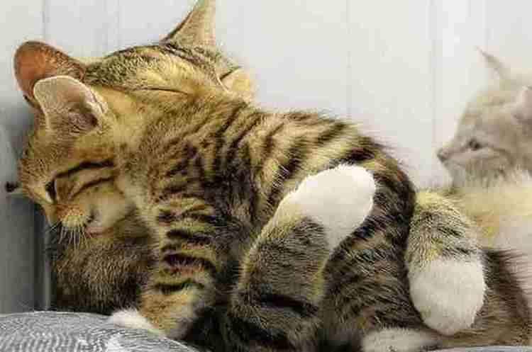 Danielle ha costruito un nido nella doccia in modo che il gattino potesse facilmente accudire la mamma da una distanza di sicurezza dall'acqua, ma Minnie, completamente senza paura, esce di lì, perché vuole stare vicino alla mamma